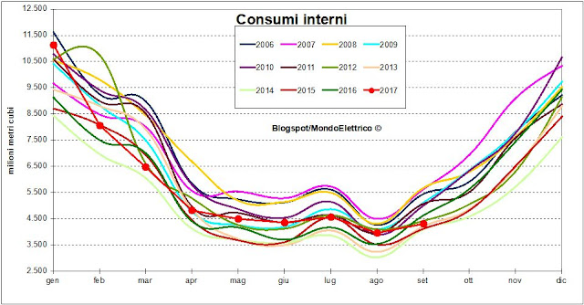 Dunque rileviamo che nel mese di Settembre il consumo scende del 7,4% rispetto allo stesso mese del 2016. Quantitativamente a Settembre abbiamo bruciato e messo in rete 4.309,196 milioni di m3 Standard (dato provvisorio Snam) contro i 4.595,181 milioni di metri cubi (dato ufficiale del Ministero) dello stesso mese del 2016.